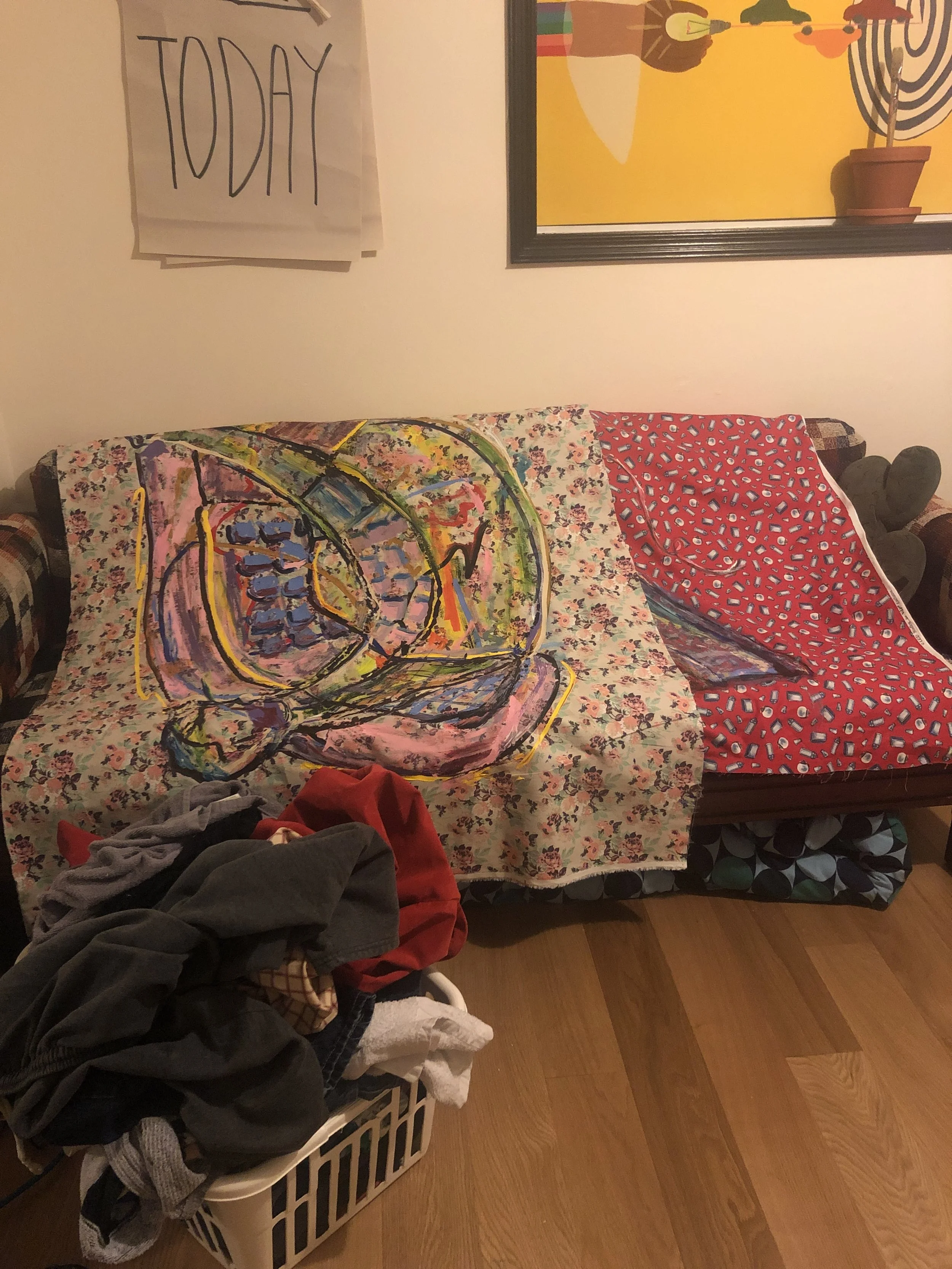 After I finished making the video, I decided to paint big!! I’ve been wanting to paint big for months. I painted the figure “Barnett” on top of the written text “Meaning” on the sheet. I love Barnett. I posted a video of me painting Barnett, but then I felt embarrassed. I feel like people think my work is silly..