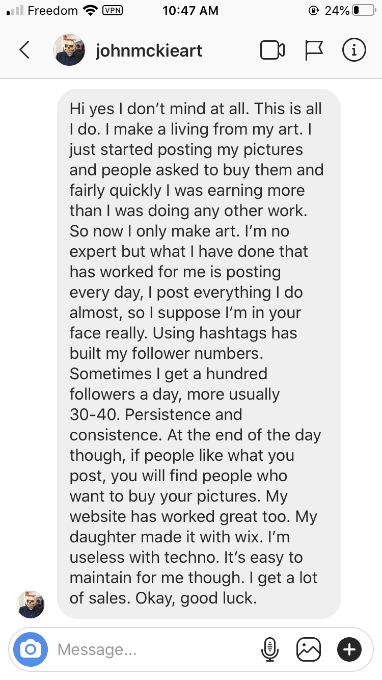 Yesterday evening I painted “Snakes & Ladders” and it turned out wonderfully! Today I painted “The Krusty Krab”. It is good. I want to show it in an art show in the future. John Mckie replied on Instagram saying he started posting everyday and using tags and eventually people were messaging him to buy his artwork and he was making more money from his art than his full-time job. It’s sweet he took the time to write me that message. I am going to be creative everyday..tomorrow I will wake up, get ready, have tea, and paint.
